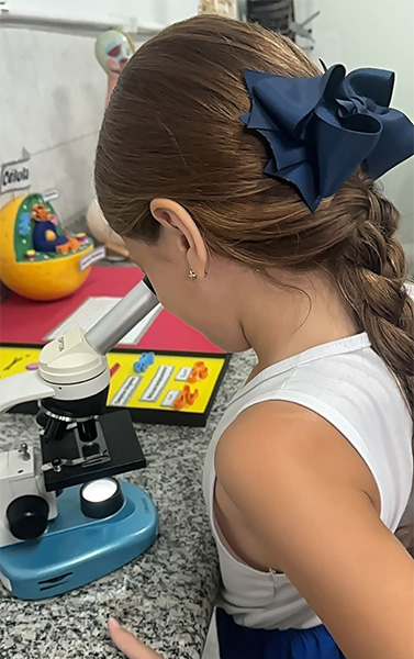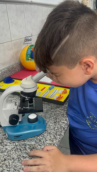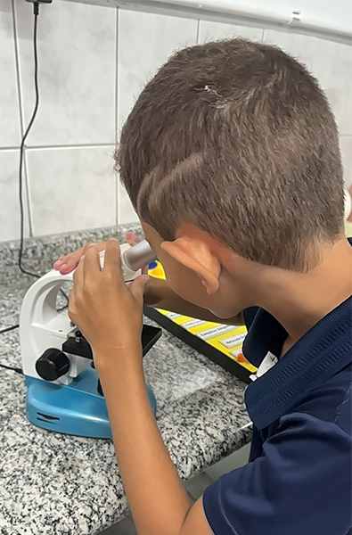 A turminha do 4º ano, junto com a professora Elaine, viveu uma experiência super especial explorando o microscópio. Eles observaram de pertinho um fio de cabelo e colocaram a mão na massa realizando as atividades da apostila!