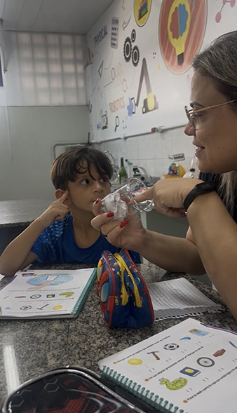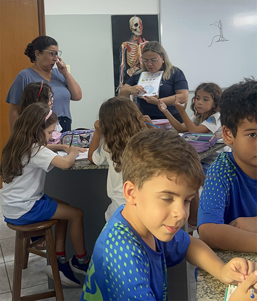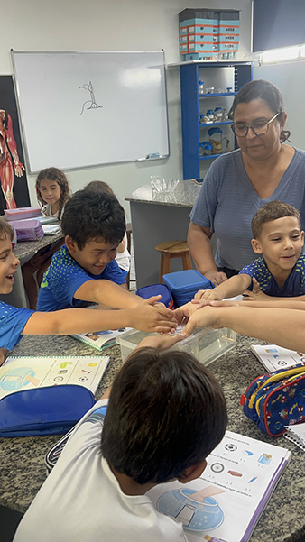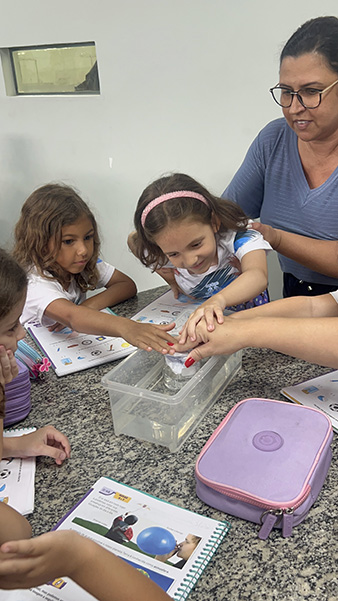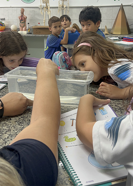 Para tornar a aprendizagem ainda mais significativa, a turma realizou uma experiência incrível: Ao colocar o copo dentro da bacia com água, a bolinha não molhou!