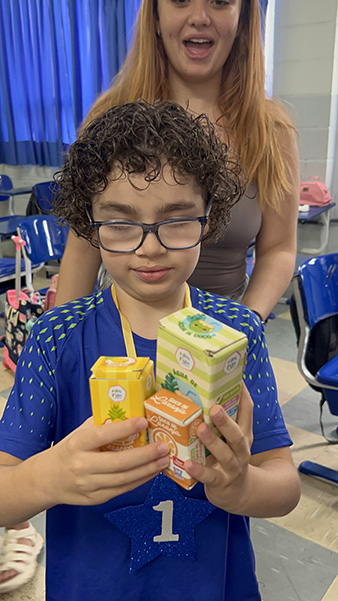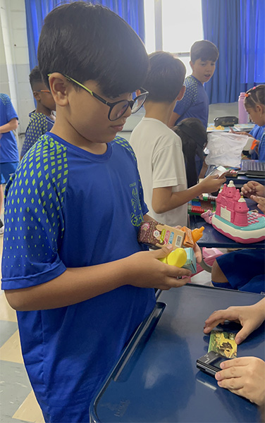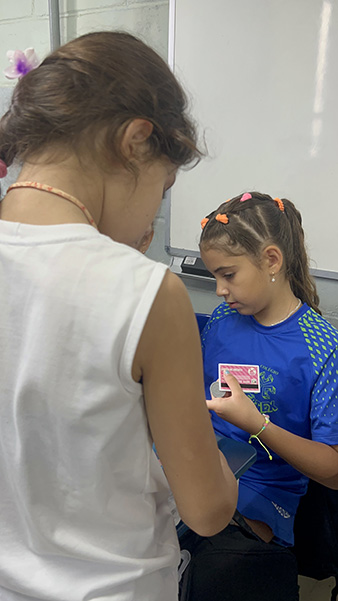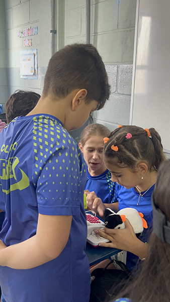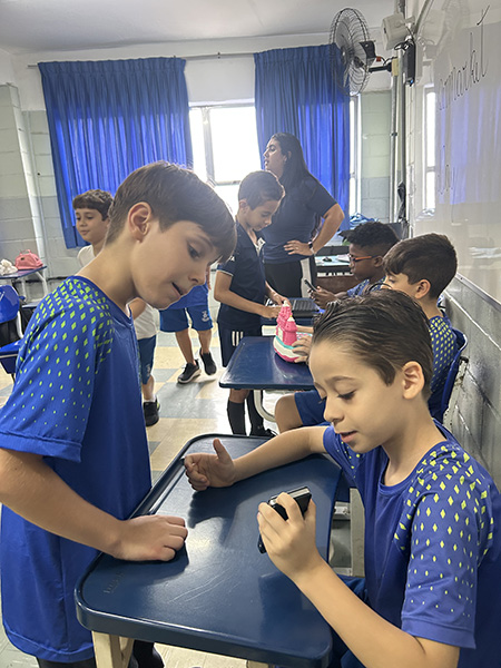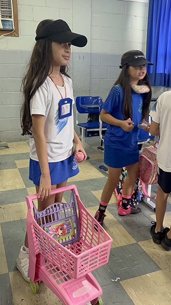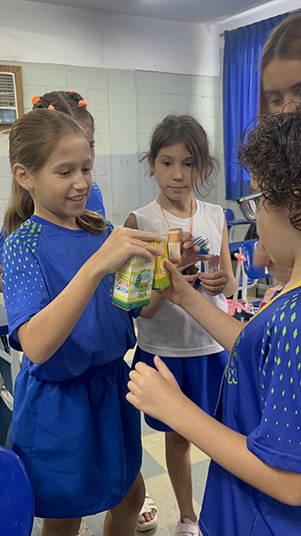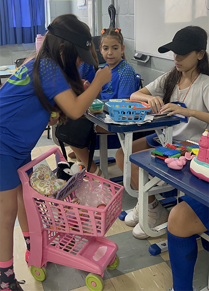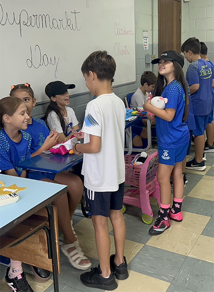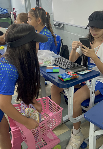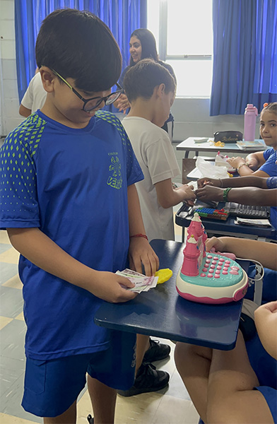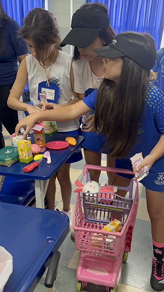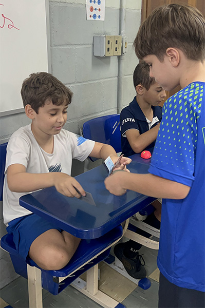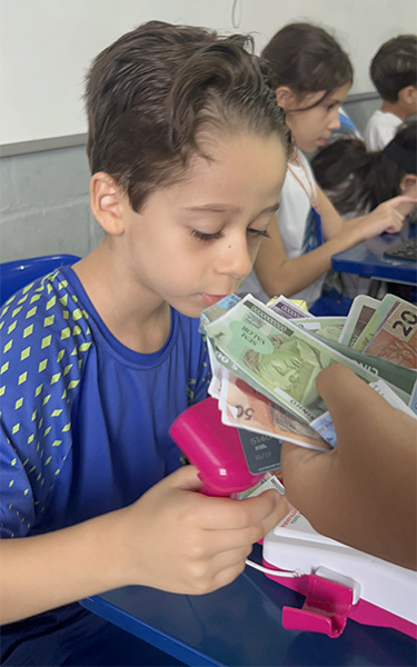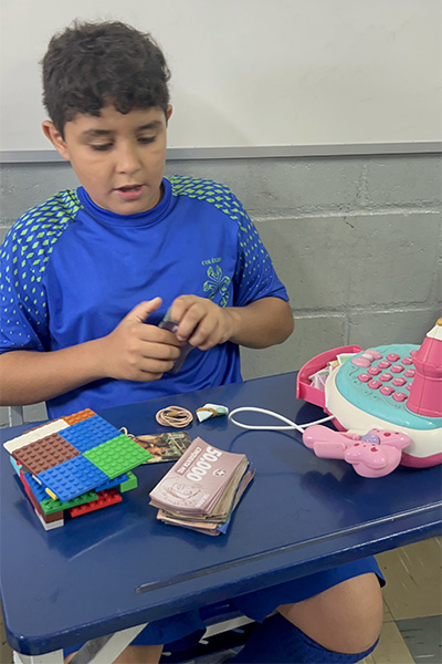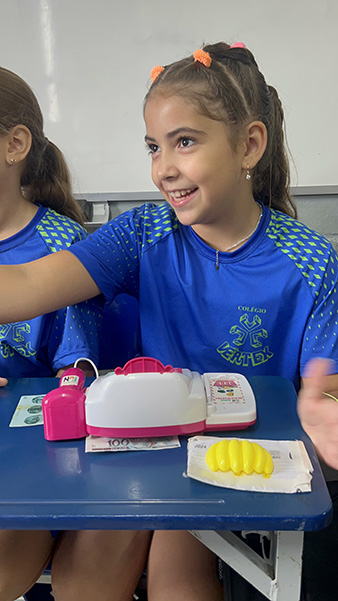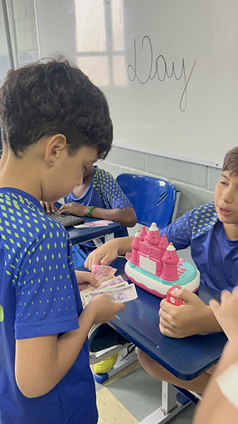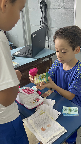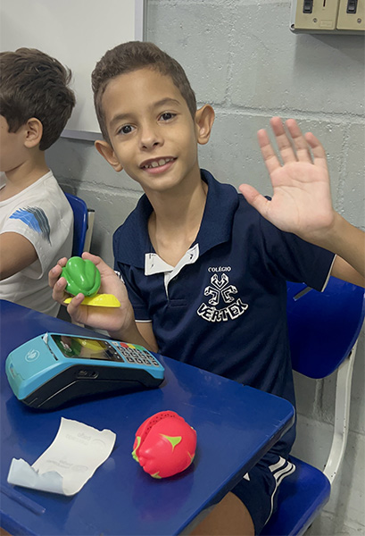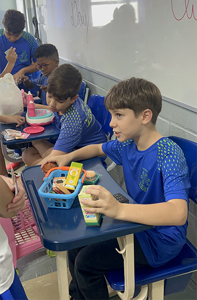 A sala de aula foi transformada em um mercadinho, assumindo papéis de clientes e caixas, praticando vocabulário, perguntas e respostas em inglês de forma leve e dinâmica.