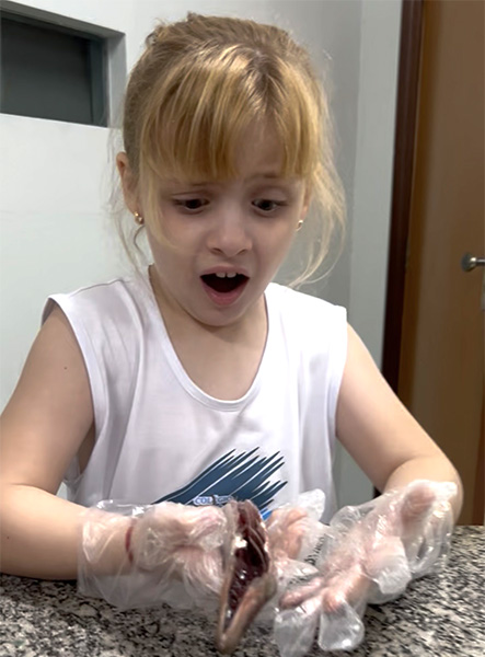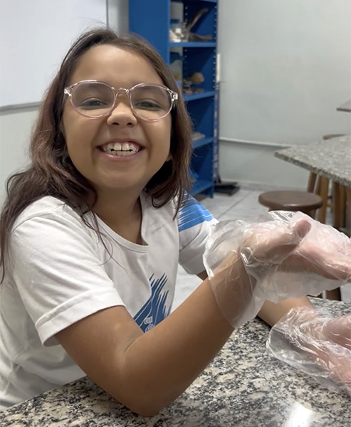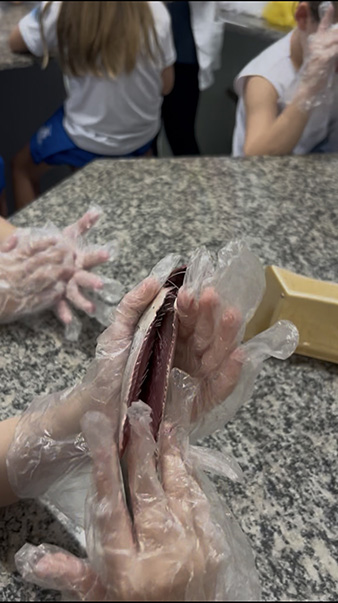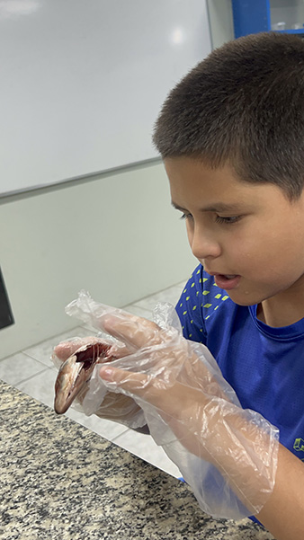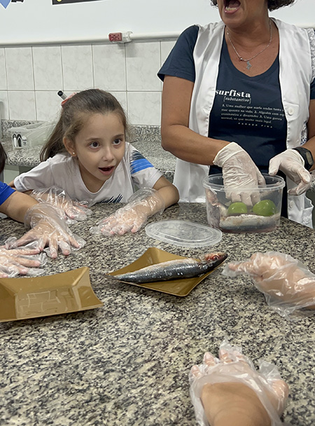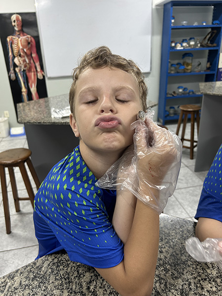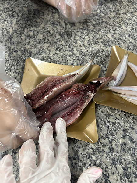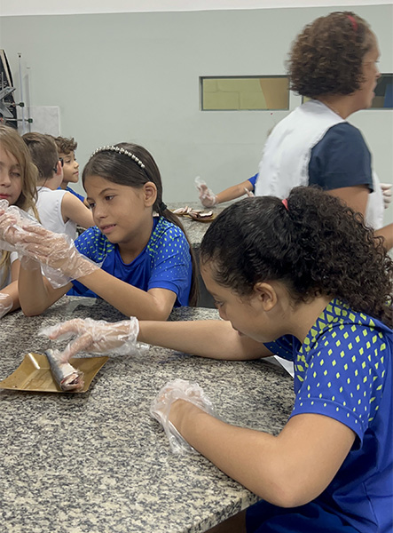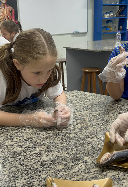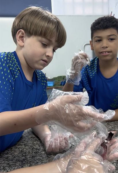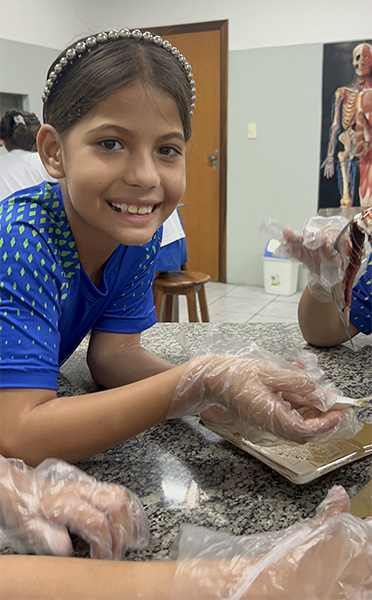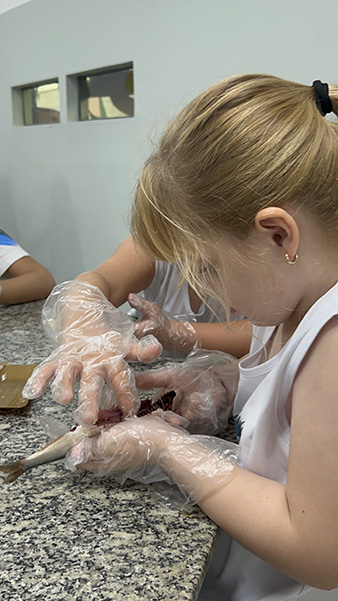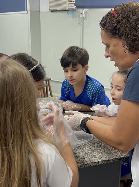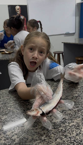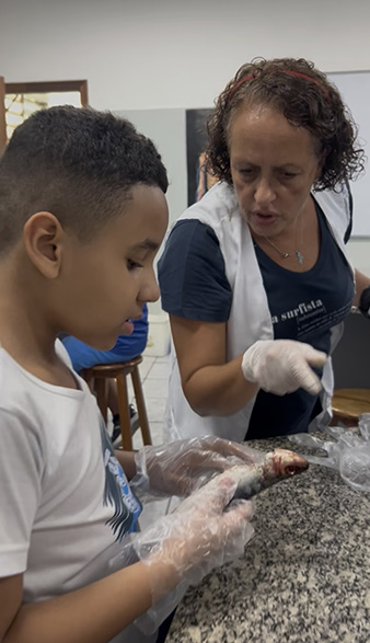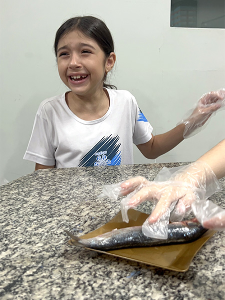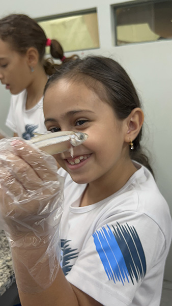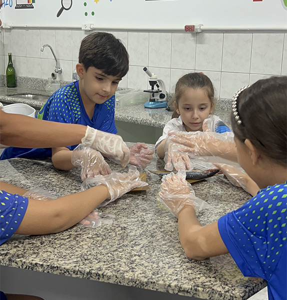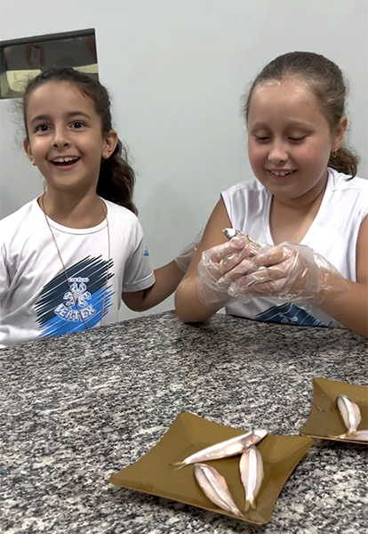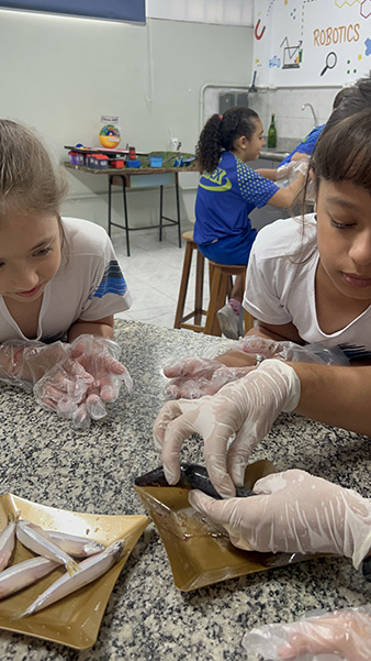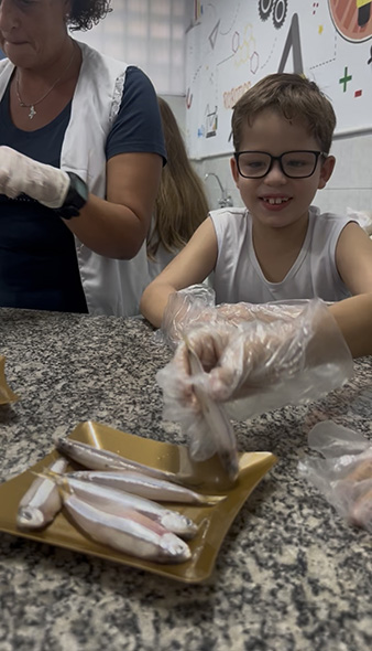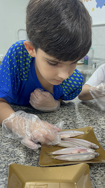 Durante a aula da professora Sandra a turma pôde observar de perto uma sardinha e uma manjuba, explorando a anatomia desses animais. Eles analisaram a coluna vertebral, identificaram os espinhos, observaram as brânquias, que são responsáveis pela respiração e compreenderam, na prática, por que os peixes são classificados como animais vertebrados.