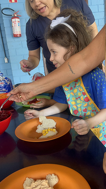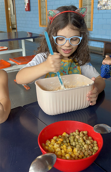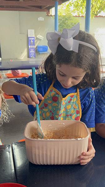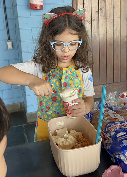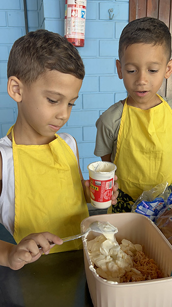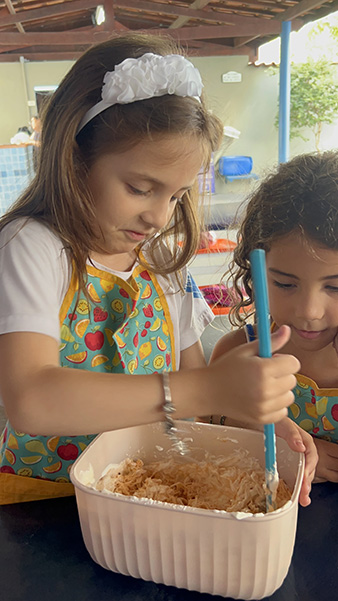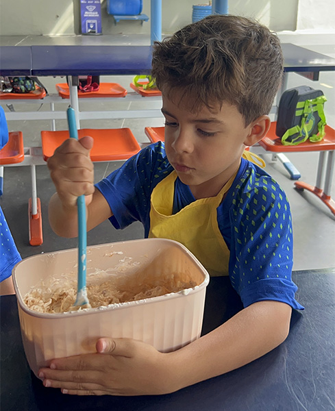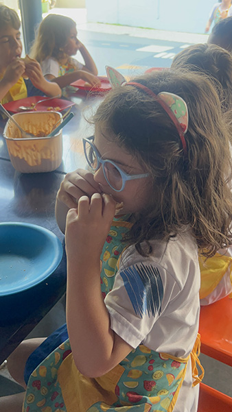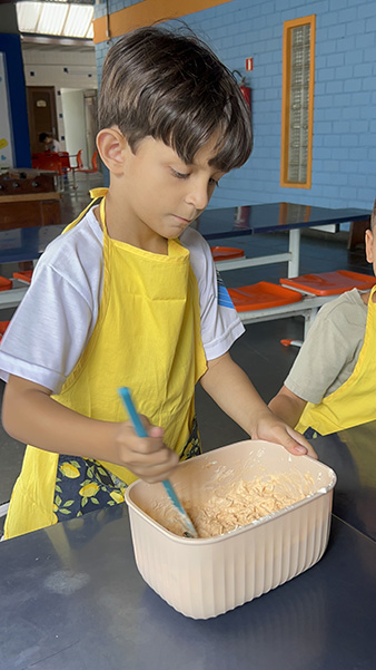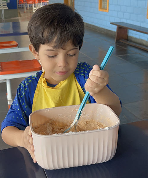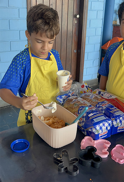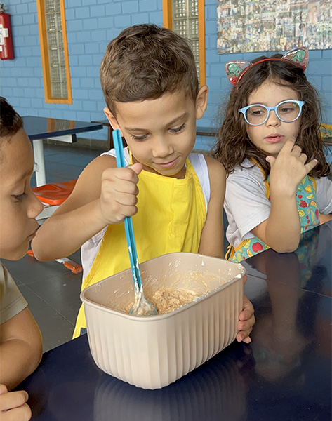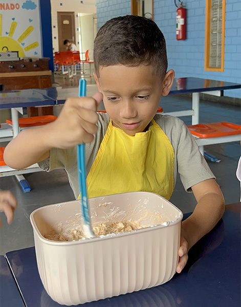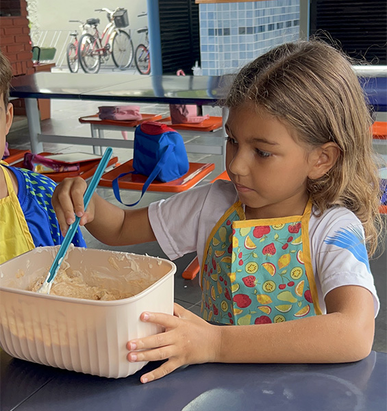 Por aqui já começamos colocando a mão na massa! No projeto, os alunos aprendem na prática sobre alimentação saudável, higiene e trabalho em equipe, enquanto descobrem novos sabores e a importância de bons hábitos alimentares.
