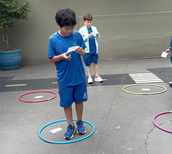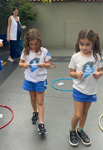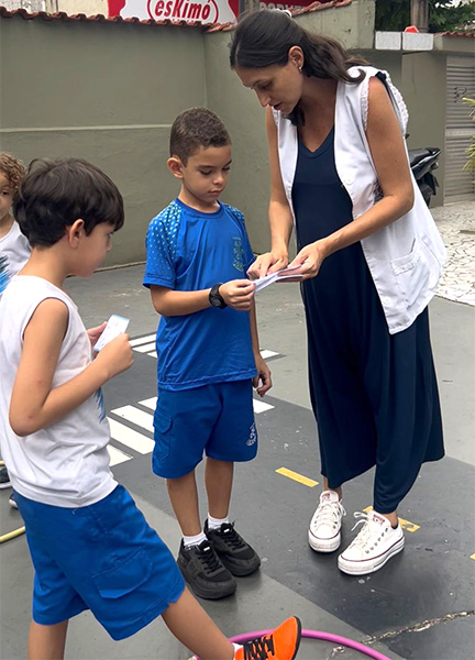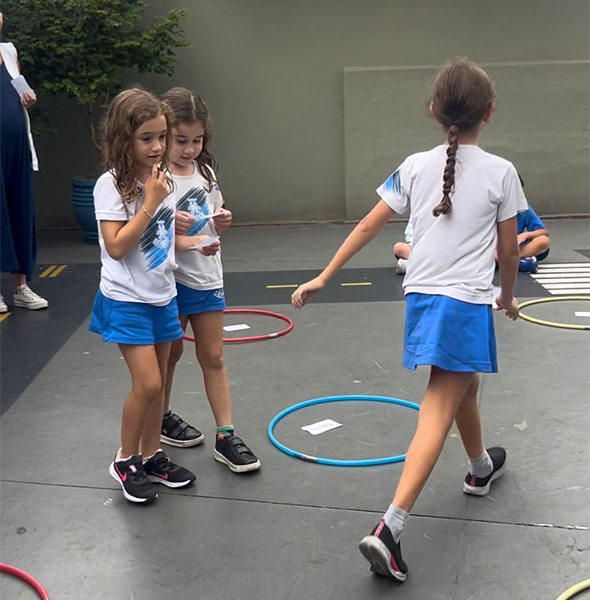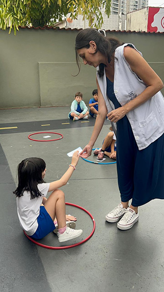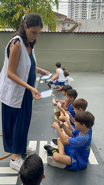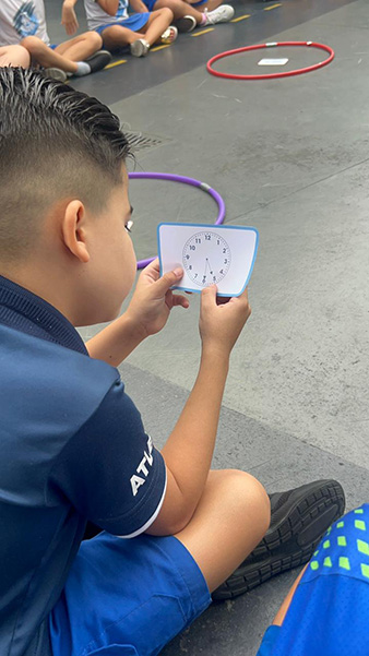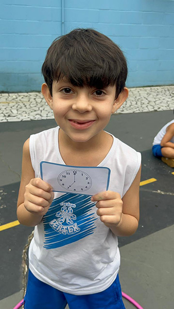 E teve prática também! Na dinâmica “Corre para o horário certo”, a turma participou com entusiasmo, associando os horários entre o relógio analógico e o digital.